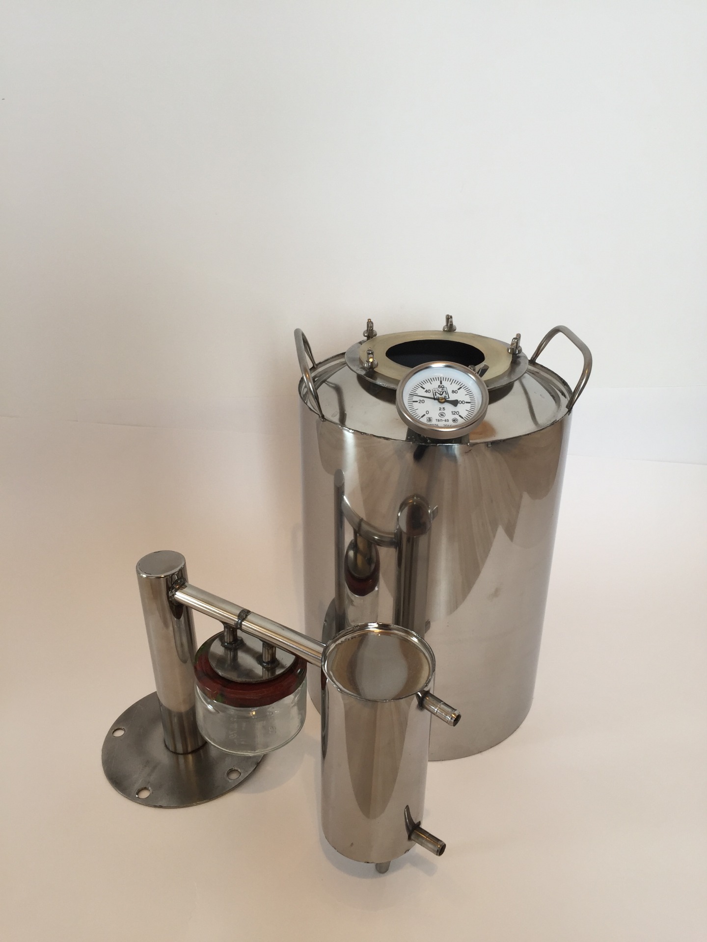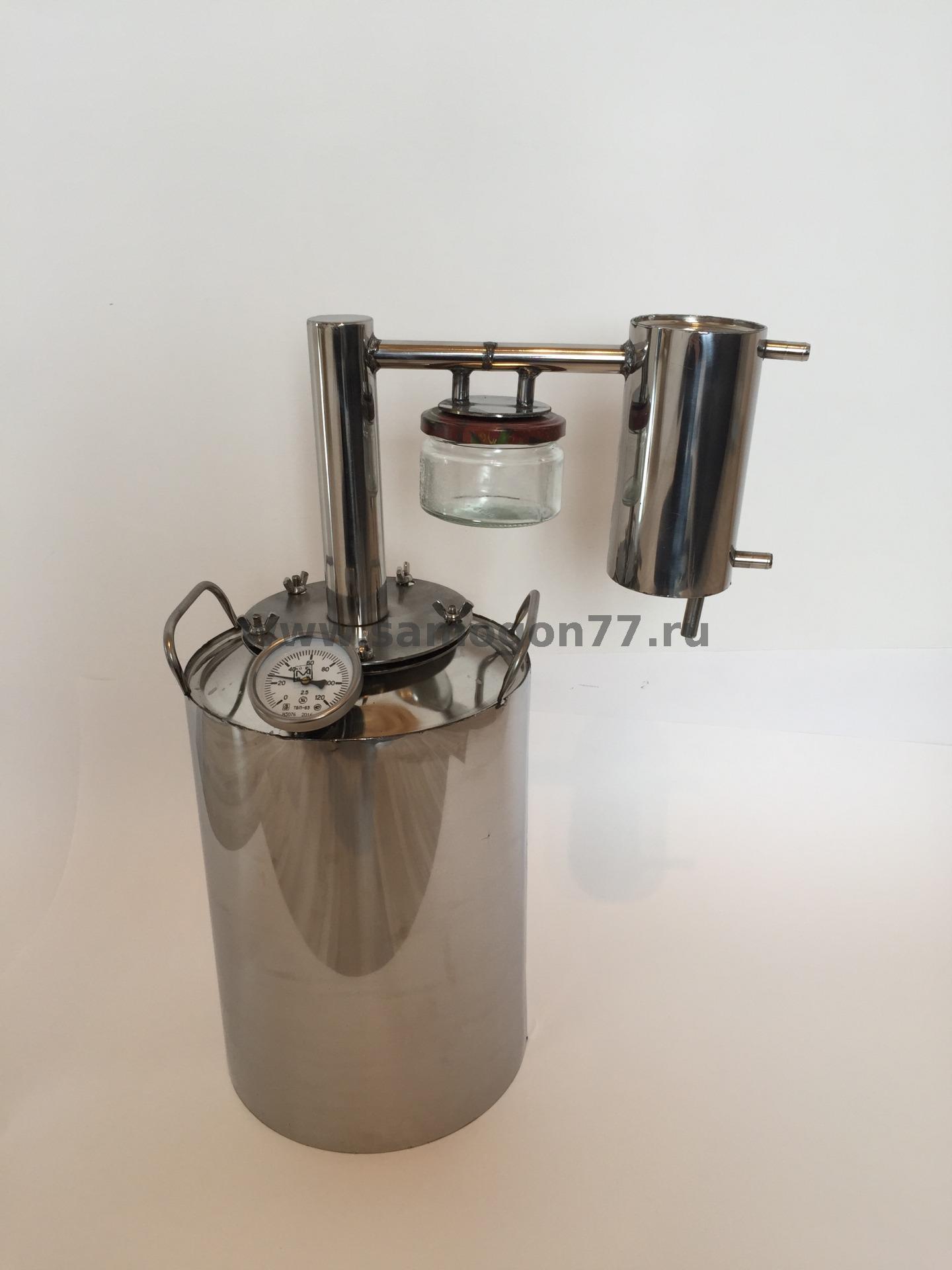 · Готовый для перегонки самогонный аппарат 20л высокой производительности до 2,5л/ч. С разборным сухопарником(банкой) и вертикальным охладителем.