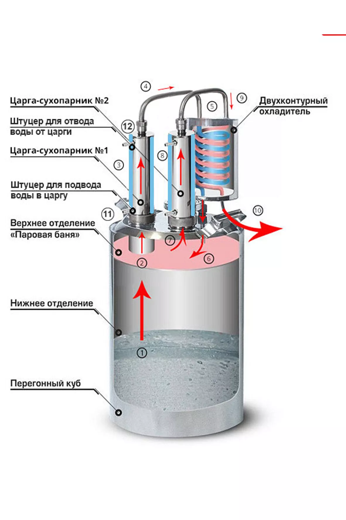 Нижнее отделение перегонного куба (1) подвергается нагреванию, в результате чего спиртосодержащие пары начинают поступать в первую царгу-сухопарник (3) оставляя в ней значительную часть сивушных масел и вредных примесей. Затем пары попадают в охладитель-змеевик проточного типа (5). Конденсируясь, дистиллят попадает в паровую баню, на второй цикл — верхнее отделение устройства (6). Здесь происходит его незамедлительное нагревание от тепла нижнего отделения, что приводит к поступлению спиртосодержащих паров во вторую царгу-сухопарник (8), где происходит повторная очистка от вредных примесей и сивушных масел. Чистый продукт попадет в охладитель (9), конденсируется и поступает на сливную трубку для сбора готового продукта.