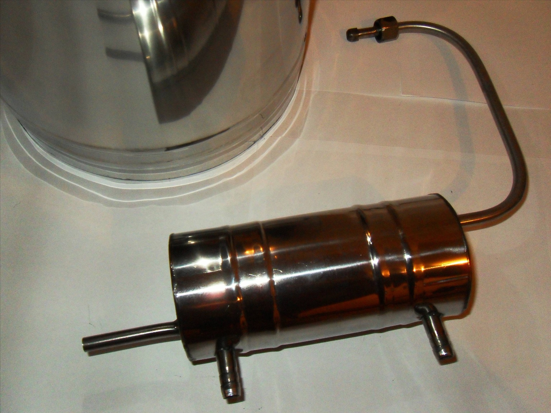 · Охладитель расположен вертикально это увеличивает производительность аппарата, в связи с тем что продукт перегонки не задерживается в спирале, тем самым не создавая препятствие пару, а плвно стекает по охладителю вниз.
