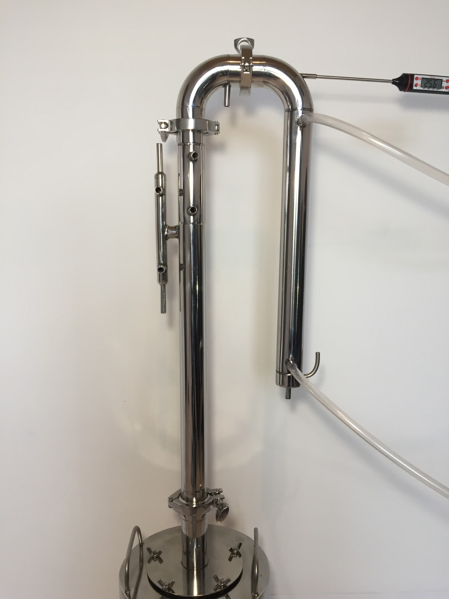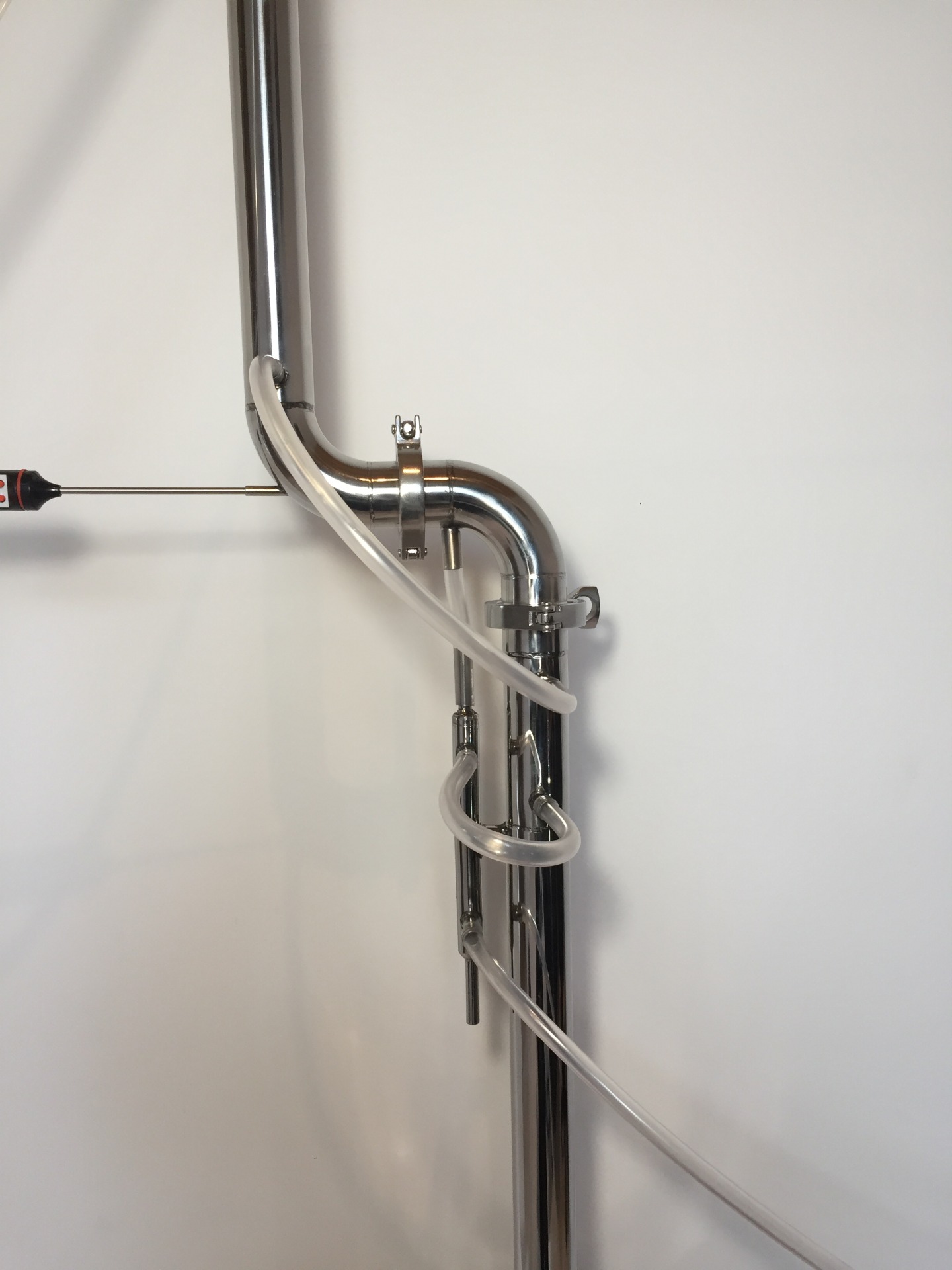 - Узел отбора встроен в верхний угол, при повороте в режим "Ректификационной колонны" дополнительный холодильник становится под узлом отбора и соединяется гибким шлангом.