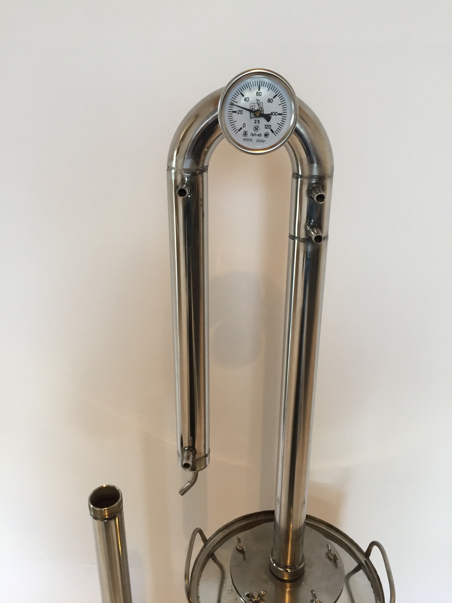 · Колонна имеет четырехниточный ДЕФЛЕГМАТОР с активным охлаждением, он способствует получить продукт с более высокой степенью очистки. В дефлегматоре происходит охлаждение спиртосодержащих паров, тем самым сивушные масла оседают на стенках дефлегматора и поподают обратно в куб. Спиртосодержащие пары прошедшие очистку в дефлегматоре попадают в холодильник и в виде дистиллята стекают в емкость для сбора продукта.